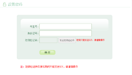 输入考生号,身份证号,点击“发送短信验证码”按钮后,系统会随机发送数字验证码至考生报名时所填的手机号上;填写完短信验证码,点击“确定”,跳转至考生修改密码页面,设置考生登录密码。请勿频繁点击“发送短信验证码”按钮。
