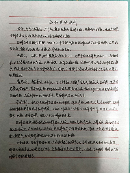活动自开展以来,得到广大同学的积极响应,大家用文字描绘池州的山水美景、民俗风情,用笔写下了自己对“第二故乡”池州的感情,同学们通过文字,走近池州、了解池州、宣传池州。