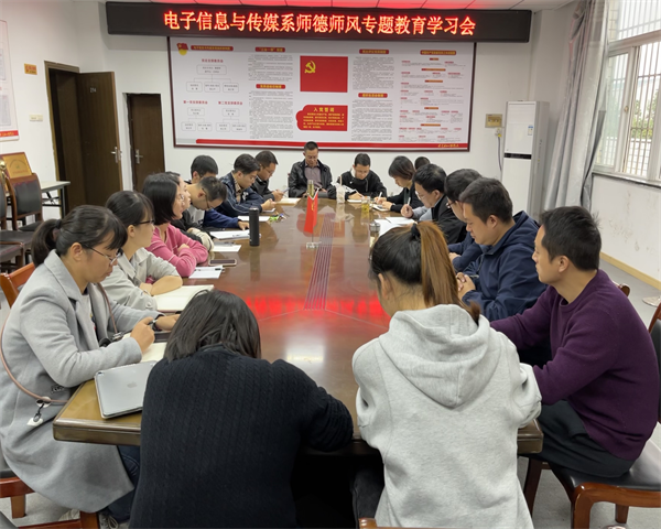 为进一步加强新时代师德师风建设,教育引导教师们爱岗敬业,规范职业行为,电子信息与传媒系于10月11日下午,在系会议室召开师德师风专题教育学习会。该系党总支书记唐建军、副主任汪来法、高文俊以及全体教师参会。